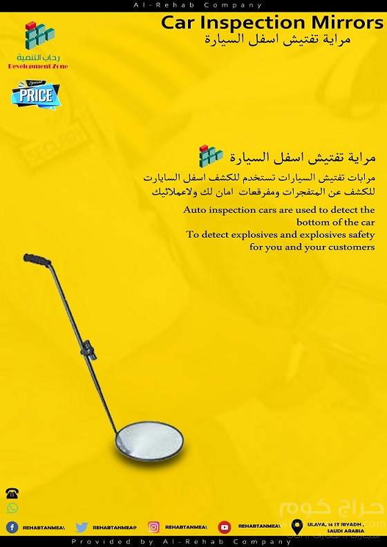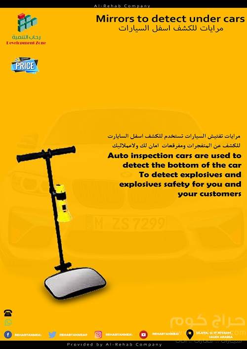 نقدم لكم وبسعر مناسب كاميرا كشف وفحص أسفل السيارة، للكشف عن الأسلحة والمتفجرات والمخدرات، وهي سهلة الفك والتركيب، وتستخدم في المولات ونقاط التفتيش والشركات، ويوجد لدينا أيضا المصدات والحواجز الأمنية والشوكية وبوابات دخول وخروج السيارات.فروعنا بالمملكة:جدةـالخبر،قصيم،الرياض..ولنا فروع في البحرين. للتواصل عبر الواتساب:0598589293