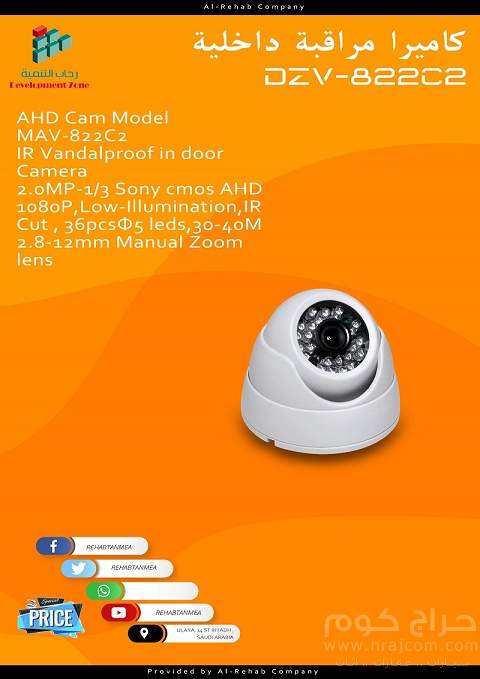 ذات كفاءة عالية وجودة ممتازة تبدأ ب 2 ميجا بيكسل الي اعلى جودة حسب رغبة العميل وهناك ايضا مجموعه من كاميرات المراقبة بالرياض وايرلس وكاميرات مراقبة للسيارات صغيرة الحجم و بأرخص الاسعار، الكاميرات موجودة لدي شركة رحاب التنمية جميعها اصلية والشركة الوكيل الحصري لكبري الشركات المنتجة للأنظمة الامنية .