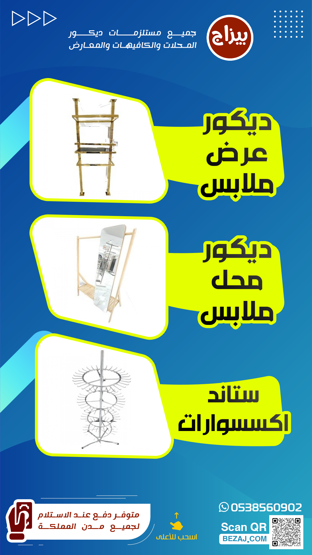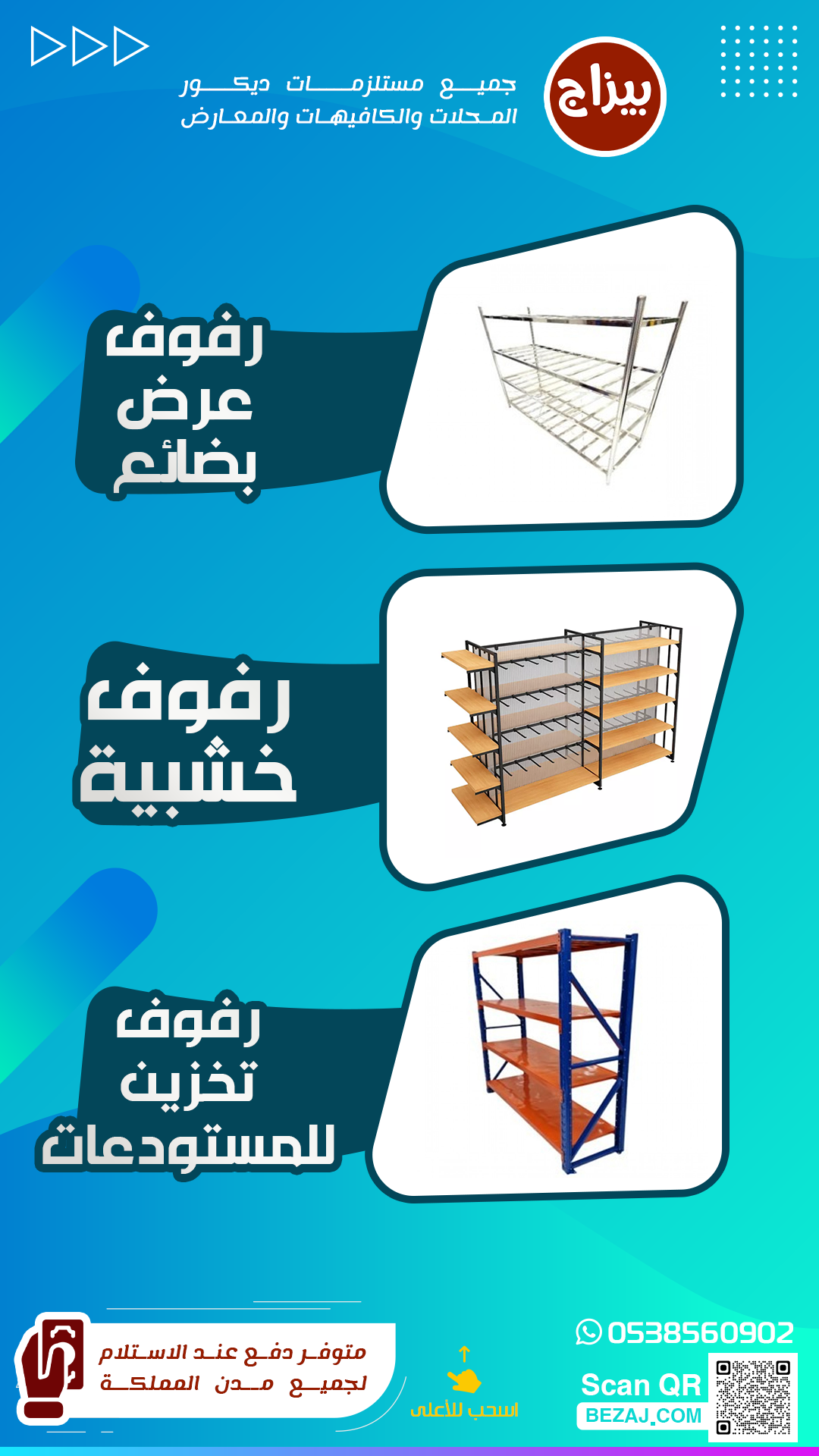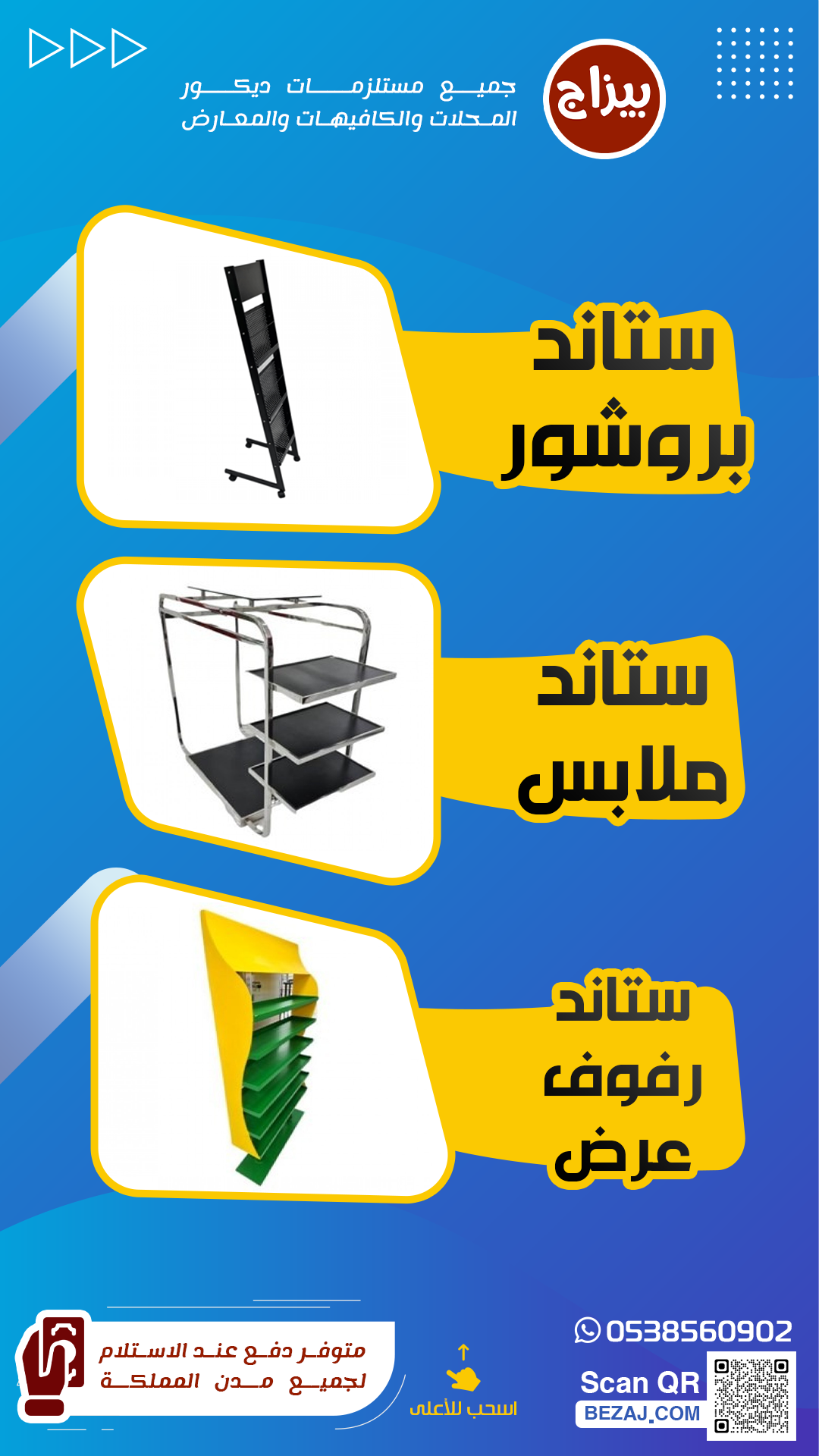 نوفر جميع مستلزمات المحلات التجارية بجميع أنواعها مثل ستاندات العرض والرفوف الجدارية ورفوف العرض وكراسي وطاولات الكافيهات