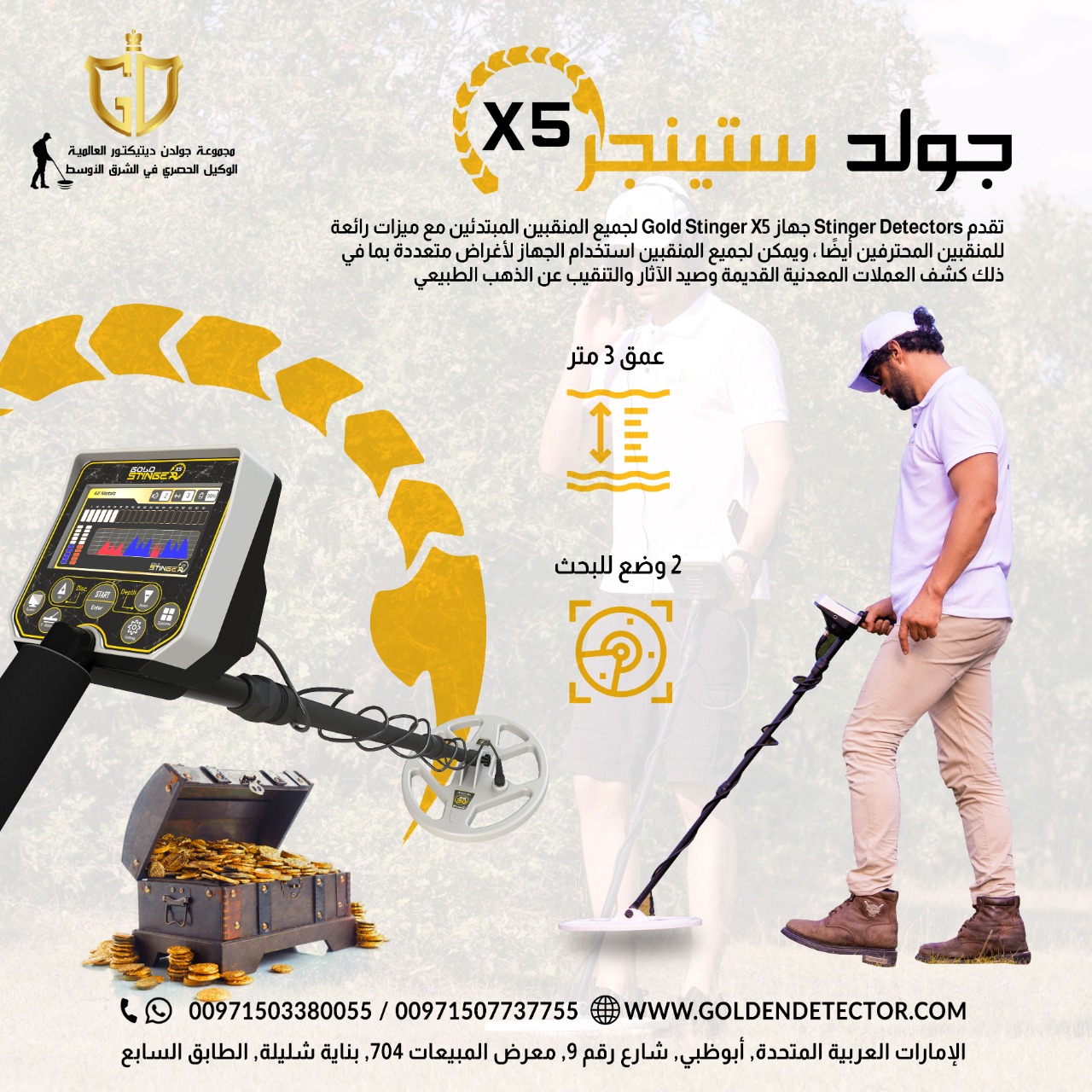 اكتشف الذهب الطبيعي والعملات القديمة والآثارمع جهاز جولد ستينجر اكس 5التقنية الامريكية من شركة Stinger Detectors الاحدث للكشف عن المعادن والذهب مع افضل اداء و امكانية الوصول الى اكتشاف اهداف على عمق اكبر .جهاز Gold Stinger X5 جهاز كشف معادن لجميع المنقبين المحترفين والهواة والباحثين عن الكنوز متعدد الاستخدامات لكشف الاهداف المختلفة تحت الأرض بفضل ميزاته المتنوعة تم اختبار أداء الجهاز في الكشف عن أنواع مختلفة من الأهداف المعدنية بأحجام مختلفة ، والتي تم تصنيعها من أنواع مختلفة من المعادن (ذهب – فضة – نحاس ..) وعلى اعماق مختلفة وقدم نتائج باهرة خصوصا في مجال التمييز بين المعادن المختلفة والعمق الاقصى للبحث .يوفر الجهاز للمنقبين العرب ميزات خاصة تتضمن برنامج سهل الاستخدام عبر واجهة استخدام رسومية عبر نظام قوائم باللغة العربية مع تمثيل مرئي رسومي للاشارات الملتقطة والتي تمثل الاهداف المتنوعة وفق نوعها .لطلب الدعم أو للمزيد من الإستفسار عن الأجهزة والشحن :0097156359244700971507737755للتواصل معانا :00971562775552لزيارة الموقع الخاص بالشركة ومعرفة كافة التفاصيل حول الجهاز :https://www.goldendetector.com/product/جولد-ستينغر-اكس-5/