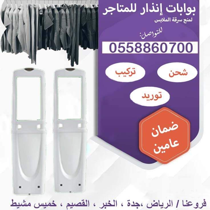 متوفر لدينا البوابات والتاجات ومغناطيس فك التاج والليبل وجهاز الغاء تفعيل الليبل، وجميع مكونات واجهزة منع سرقة الملابس وبأفضل اسعاروتتكون منظومة انذار سرقة الملابس من مكونات اساسية وهي:البوابات الألكترونيةاتاج المثبت بقطعة الملابسجهاز فك التاجنقوم بالتوريد والتركيب والصيانه بكافة انحاء الممملكة العربية السعوديةللتواصلت / واتس0558860700