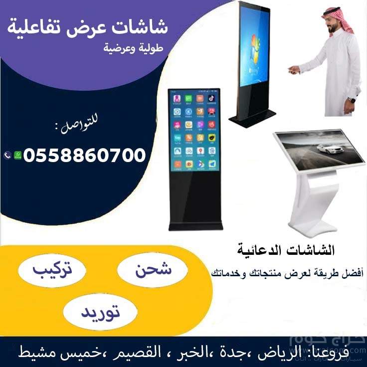 شاشات العروض الإعلانية الدعائية هي أداة فاعلة جدا فى العروض الدعائية أو الأنشطة التعليمية التفاعلية يمكنكم عرض اى مادة بأى صيغة عرض وذلك عن طريف وحدة الادخال فلاشه أو عن طريق الاتصال بالشبكة العنكبوتية مباشرة يمكن التحكم في المادة المعروضة عن طريق الريموت الخاص بالشاشة تعمل بنظامي الويندوز أوالأندرويد توجد أحجام مختلفة تبدأ من 43 بوصة وحتى 75 بوصة كما يوجد موديل الشاشات الطوليه وكذلك الشاشات العرضية تعمل باللمس وبدون شاشات العروض التفاعلية لكل أصحاب النشاطات التى تحتاج إلى مادة اعلانية معروضة وكذلك لكل النشاطات التفاعليه ولذا فهي مناسبة جدا للفنادق والمعارض للمراكز التعليمية والمدارس وللعديد من الأنشطة المشابهةشاشات تفاعلية#شاشة تفاعلية#شاشات عرض تفاعلية#شاشة عرض تفاعلية#شاشات تفاعلية طولية#شاشات تفاعلية عرضيه#شاشات باللمس تفاعلية#شاشات بدون لمس# شاشات تفاعلية اندرويد#شاشات تفاعلية ويندوز# شاشات عرض تفاعلية للبيع# شاشات تفاعلية طولية للبيع# شاشات تفاعلية عرضية للبيع#أسعار الشاشات التفاعلية#أسعار الشاشات التفاعلية الطولية#أسعار الشاشات التفاعلية عرض تفاعلية داخلية#شاشات عرض تفاعلية داخلية شاشات تفاعلية شاشة تفاعلية شاشات عرض تفاعليةشاشة عرض تفاعلية شاشات تفاعلية طوليةشاشات تفاعلية عرضيهشاشات باللمس تفاعليةشاشات بدون لمس شاشات تفاعلية اندرويدشاشات تفاعلية ويندوز شاشات عرض تفاعلية للبيع شاشات تفاعلية طولية للبيع شاشات تفاعلية عرضية للبيع أسعار الشاشات التفاعلية أسعار الشاشات التفاعلية الطوليةأسعار الشاشات التفاعلية العرضيهشاشات عرض للفنادق فروعنا بالمملكة العربية لسعودية ودولة البحرين تواصل معنا جوال / واتساب0558860700