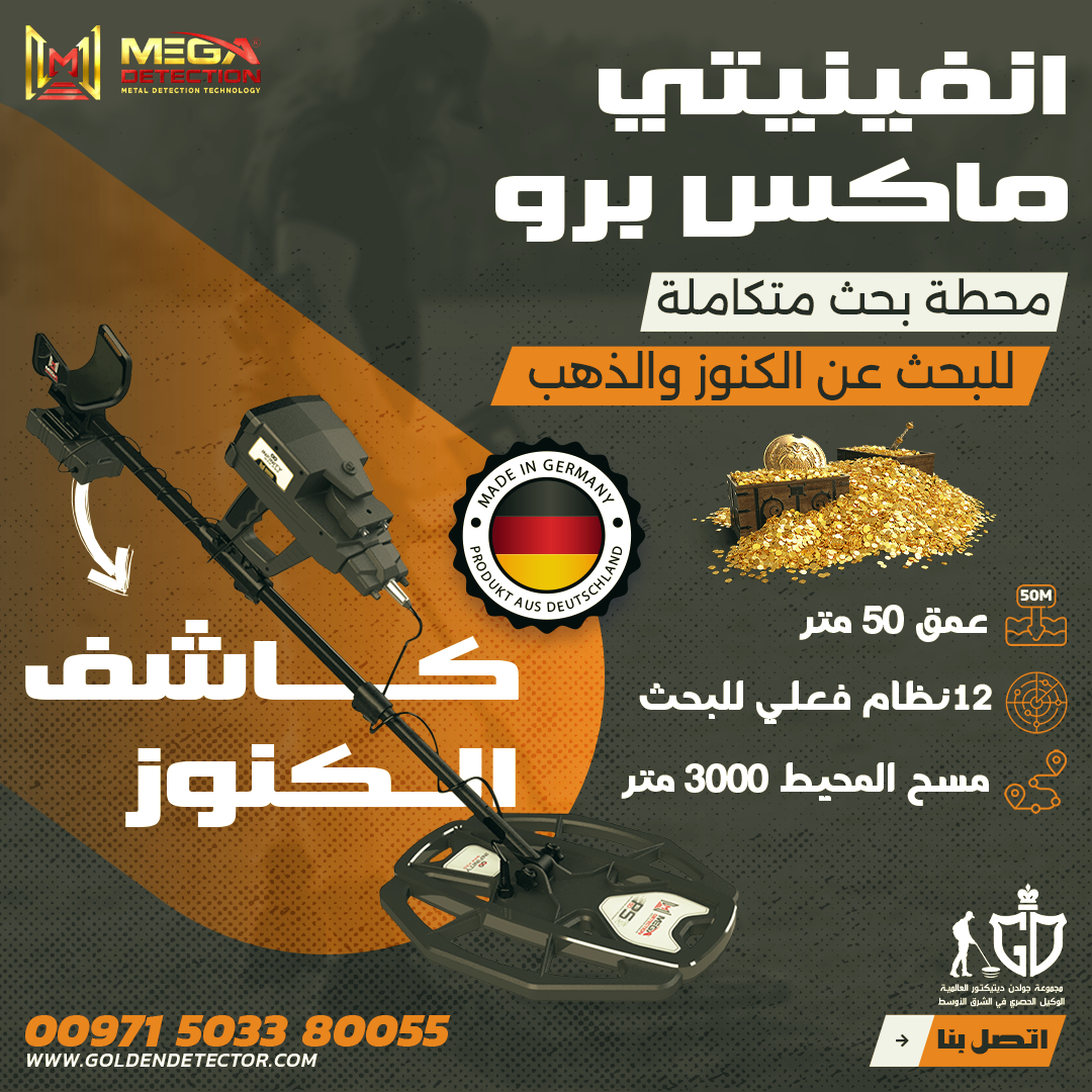 محطة متكاملة للبحث عن الكنوز و الذهب و الفراغات في باطن الارض, تحفة فنية مقدمة من مصنع ميجا الالماني تضم 12 نظام فعلي و دقيق للبحث عن جميع الاهداف الثمينة لمسافات و اعماق لم يتم الوصول لها من قبل, الجهاز المعتمد من قبل الكثير من شركات التنقيب العالمية للبحث عن الآثار و الانفاق المدفونة منذ الاف السنين, جهاز الانفينيتي ماكس برو يتربع على قمة هرم اجهزة التنقيب في العالم بكل جدارة.