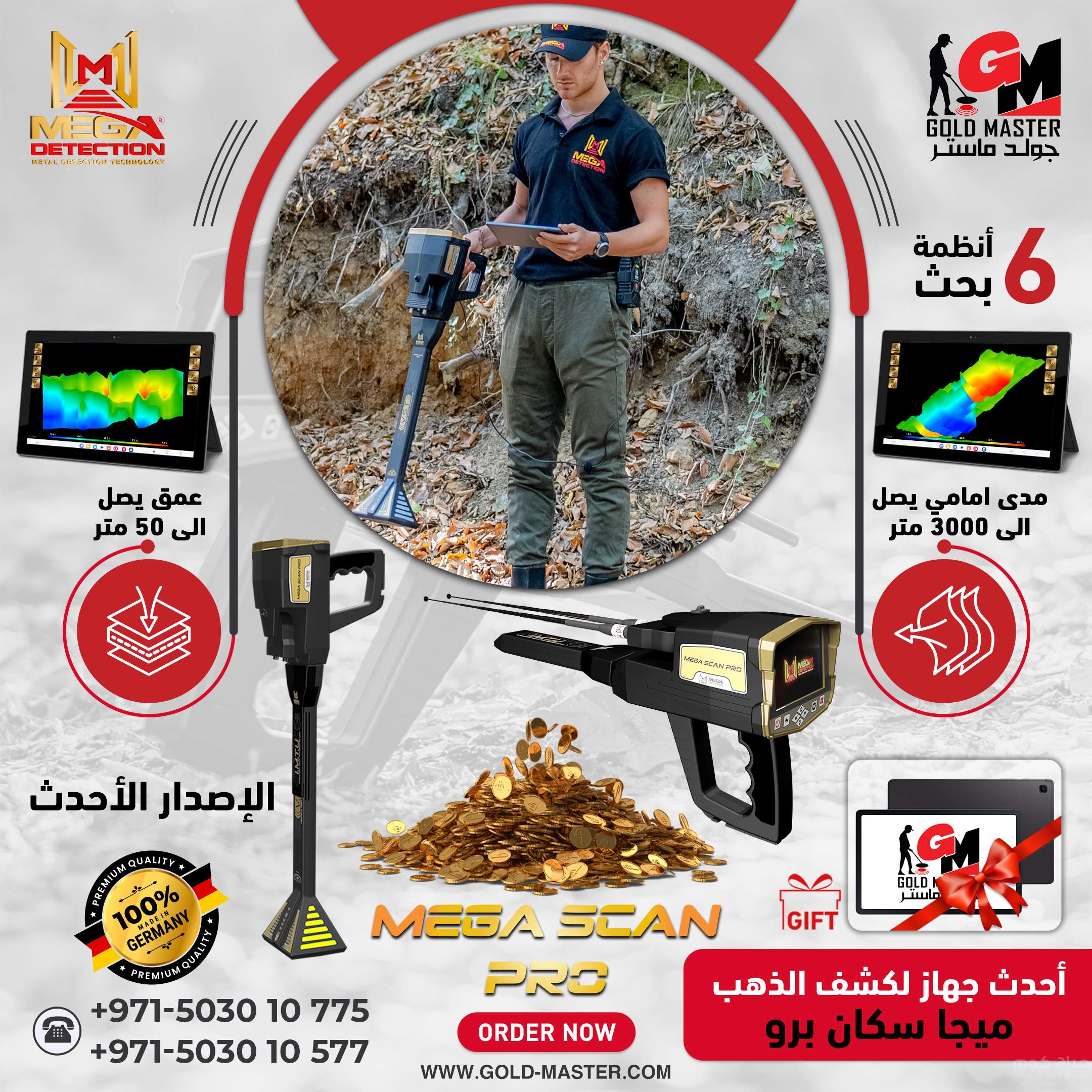 ميغا سكان برو اقوى جهاز للكشف عن الذهب والمعادن, تم تطويره خصيصًا لتلبية احتياجات منقبي الذهب والمعادن الثمينة في جميع أنحاء العالم, بميزاته المضمنة والملحقات المضمّنة والتقنيات المتقدمة الخاصة, بمثابة جهاز احترافي لجميع أنشطة الكشف عن المعادن في جميع التضاريس, يمكن اكتشاف التجاويف مثل الأنفاق والغرف المخفية تحت الأرض ، كما يمكنه اكتشاف الماس والأحجار الكريمة.