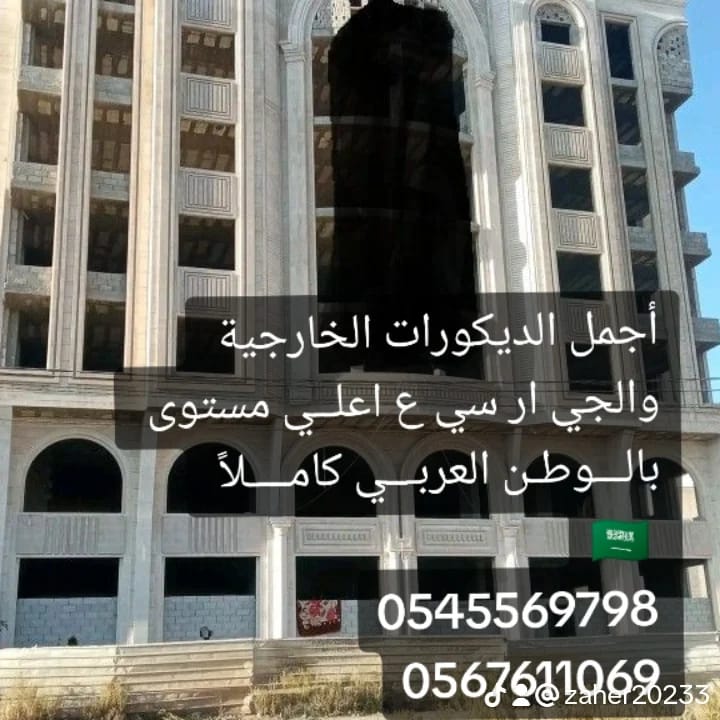 اينما كنتم ب (جده ومكه والباحه والطائف وجميع انحاء المملكه) نصلكم اينما كنتم ثقتكم هي شعارنا.أفخم أنواع الديكورت الخارجية والجي ار سي مع مؤسسه سامر الجنوب.لعشاق الفخامة أو البساطة في التشطيبات الخارجية نتشرف بتقديم خدماتنالتنفيذ جميع واجهات الجي ار سي والديكورات الخارجيةفلل - قصور - فنادق - مساجد - مولات - تزيين حدائق واسوار الفللكورنيش - اعمدة - مشربيات - درابزين - شبابيك - بوابات - قباباستعداد تام لتنفيذ كافة مشاريع الجي ار سي مع امكانية تقديم مقترحات تنفيذيةسرعة ودقة في العمل...بنقدم اسعار خاصه للغايه للمساجد والجمعيات الخيرية, التعاقد مع اكبر الشركات الداخلية و الخارجيه... تحت اشراف العناني للديكورات..... https://www.pinterest.com/jyarsy/_saved/ https://sites.google.com/view/jyarsy/https://jyarsy.blogspot.com/https://grcsamralganob.com/ https://jyarsy.wordpress.com/ https://pin.it/7jeQ73yتواصل معنا الآن:-054556979805676110690599632568نصلكم أينما كنتم ثقتكم هي شعارنا تواصل معنا الآن لتحصل على مقايسات و معاينات مجانية تحت اشراف المصمم و المنفذ و الممول / المهندس سيد العناني