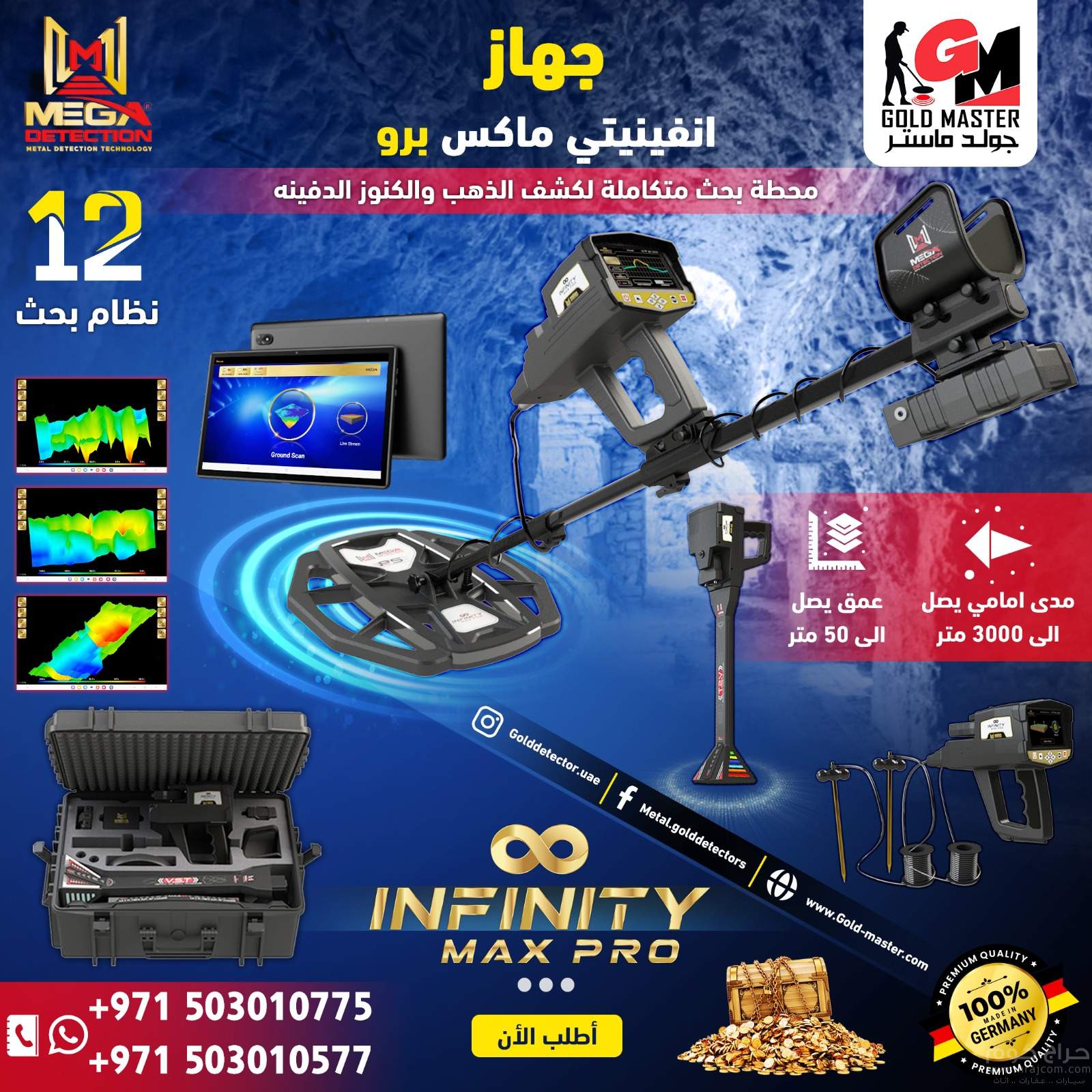 انفينيتي ماكس برو جهاز كشف المعادن من شركة ميغا ديتيكشن الالمانية احدث اصدارات الشركة لعام 2024 جهاز متكامل وشامل بفضل تعدد تقنيات البحث في الجهاز لكشف المعادن والتنقيب عن الكنوز وكشف الذهب و تطبيقات اخرى .
