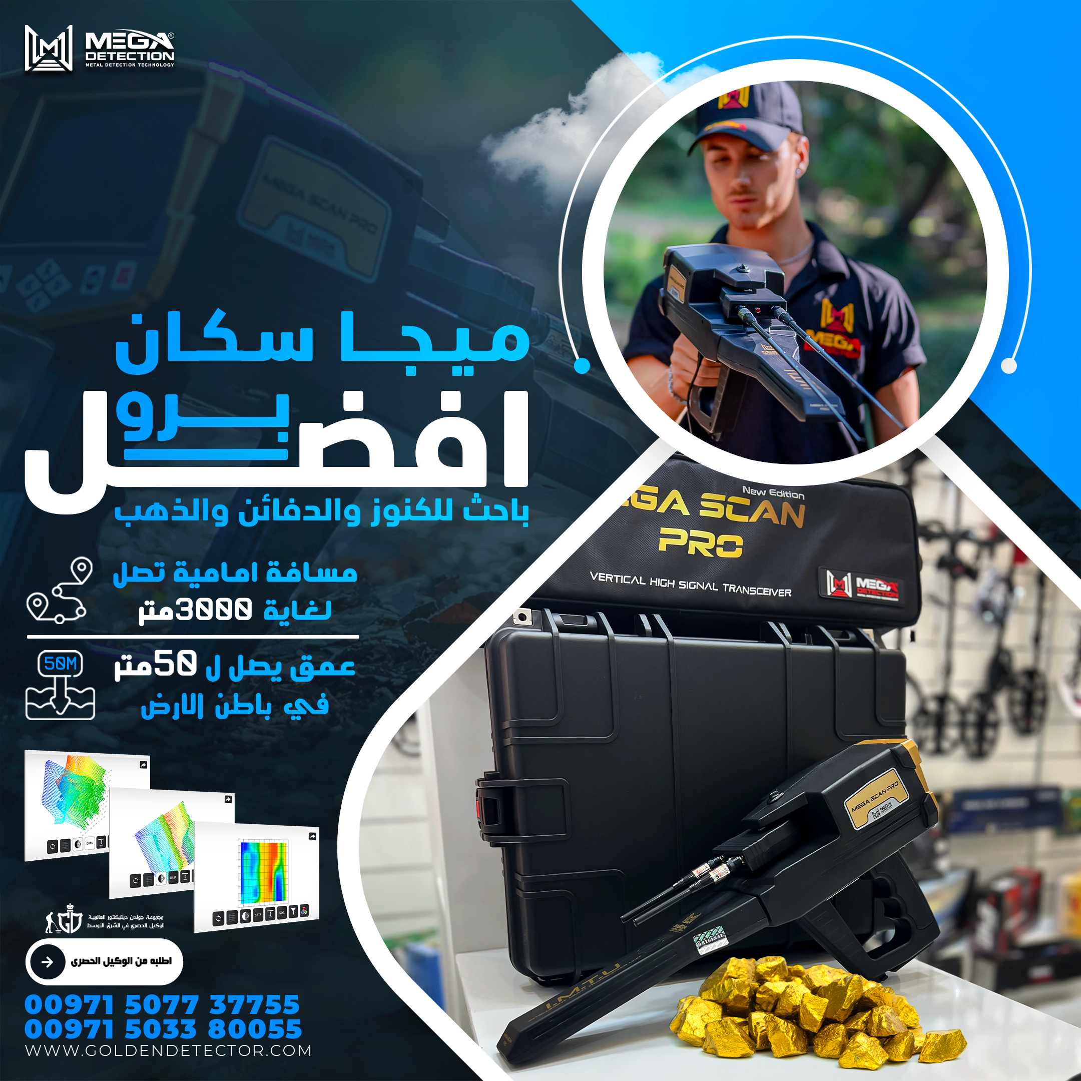 ميغا سكان برو اقوى جهاز للكشف عن الذهب والمعادن, تم تطويره خصيصًا لتلبية احتياجات منقبي الذهب والمعادن الثمينة في جميع أنحاء العالم, بميزاته المضمنة والملحقات المضمّنة والتقنيات المتقدمة الخاصة, بمثابة جهاز احترافي لجميع أنشطة الكشف عن المعادن في جميع التضاريس, يمكن اكتشاف التجاويف مثل الأنفاق والغرف المخفية تحت الأرض ، كما يمكنه اكتشاف الماس والأحجار الكريمة.