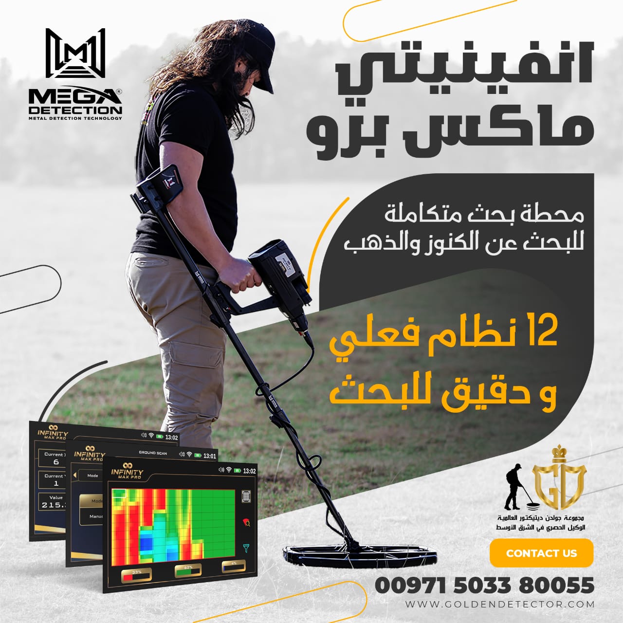 محطة متكاملة للبحث عن الكنوز و الذهب و الفراغات في باطن الارض, تحفة فنية مقدمة من مصنع ميجا الالماني تضم 12 نظام فعلي و دقيق للبحث عن جميع الاهداف الثمينة لمسافات و اعماق لم يتم الوصول لها من قبل, الجهاز المعتمد من قبل الكثير من شركات التنقيب العالمية للبحث عن الآثار و الانفاق المدفونة منذ الاف السنين, جهاز الانفينيتي ماكس برو يتربع على قمة هرم اجهزة التنقيب في العالم بكل جدارة.