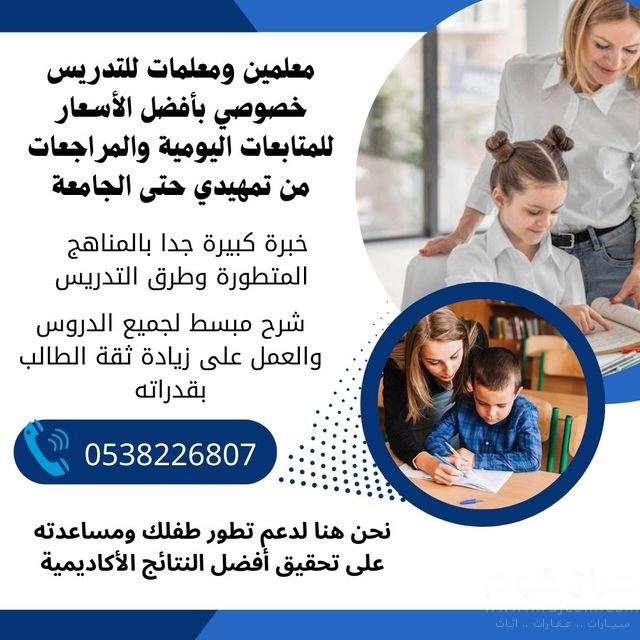 نحن في أفضل موقع معلمات بالسعودية نوفر معلمات خصوصيات بجودة عالية وخبرة واسعة. يمكنكم التواصل معنا لتحديد احتياجات الطالب ومناقشة تفاصيل الخدمة. نحرص على تقديم عروض وخصومات تناسب الجميع وتحقق النجاح المنشود للطلاب.