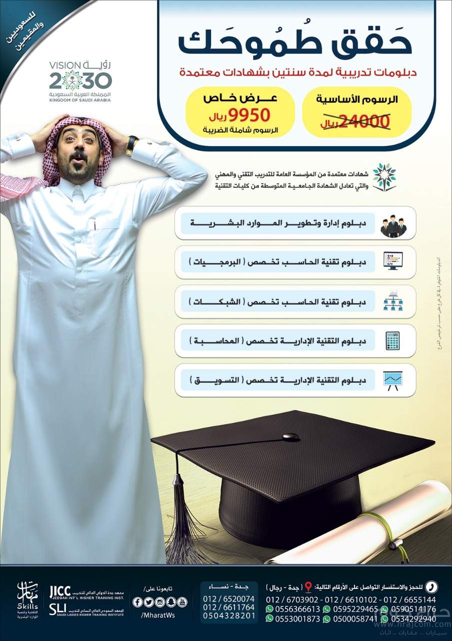 حَـــقـــق طُـمُـوحَـك ...دبلومات تدريبية لمدة سنتين بشهادات معتمدةعرض خــــاص ولفترة محدودة 9950 ريال فقط شاملة الضريبةدبلوم إدارة وتطوير الموارد البشريةدبلوم التقنية الإدارية تخصص التسويقدبلوم التقنية الإدارية تخصص المحاسبةدبلوم تقنية الحاسب تخصص البرمجياتدبلوم تقنية الحاسب تخصص الشبكاتتعقد الدبلومات في مدينة (( جدة ))شهادات معتمدة من المؤسسة العامة للتدريب التقني والمهنيوالتي تعادل الشهادة الجامعية المتوسطة من كليات التقنية(( للاستفسار نرجو التواصل عبر الهاتف أو الجوال أو الواتس أب ))
