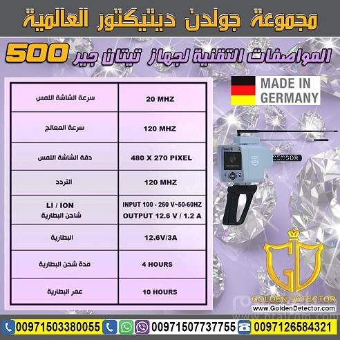 شركة جولدن ديتيكتور تقدم جهاز تيتان جير 500 المزود بجميع التقنيات العالية الدقة و العالمية بنظام الديجيتال الكامل و بحساسات استشعارية سريعة الالتقاط للهدف ليكون الأول في اكتشاف الألماس و الأحجار الكريمة في باطن الأرض.