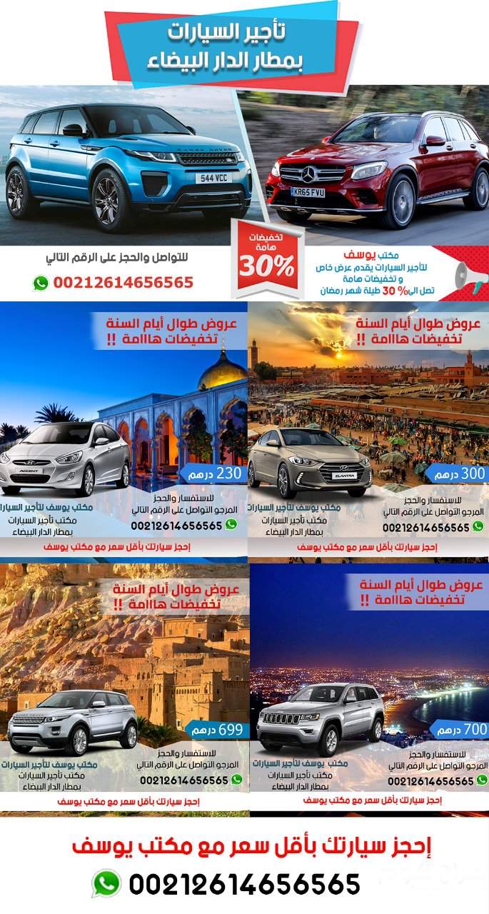 مكتب يوسف تأجير السيارات في مطار الدار البيضاءنحن نملك أهم العاملين في المجال، مدربين جيدا على طرق التعامل مع العملاء، ونعطي تعليمات مشددة على ضرورة تسهيل كل العقبات أمام الزبون لكي نرضيه، ليس هذا فقط، بل نتوفر على اسطول كبير من أهم السيارات بأحدث الموديلات.بل ونوفر لكم أسعارا لن تجدوها في أي مكان آخر.من الآن أحصل على السيارات في دقائق، ولا تتأخر على مواعيدك بعد اليوم.إسم الشركة : شركة يوسف لتأجير السيارات.خدماتنا:تأجير السيارات في مطار الدار البيضاءتأجير السيارات في مطار مراكشتأجير السيارات في مطار أغاديرتأجير السيارات في مطار الرباطللتواصل وحجز سيارتك لأن في مطار الدار البيضاء :الهاتف: 00212614656565الواتساب: 00212614656565