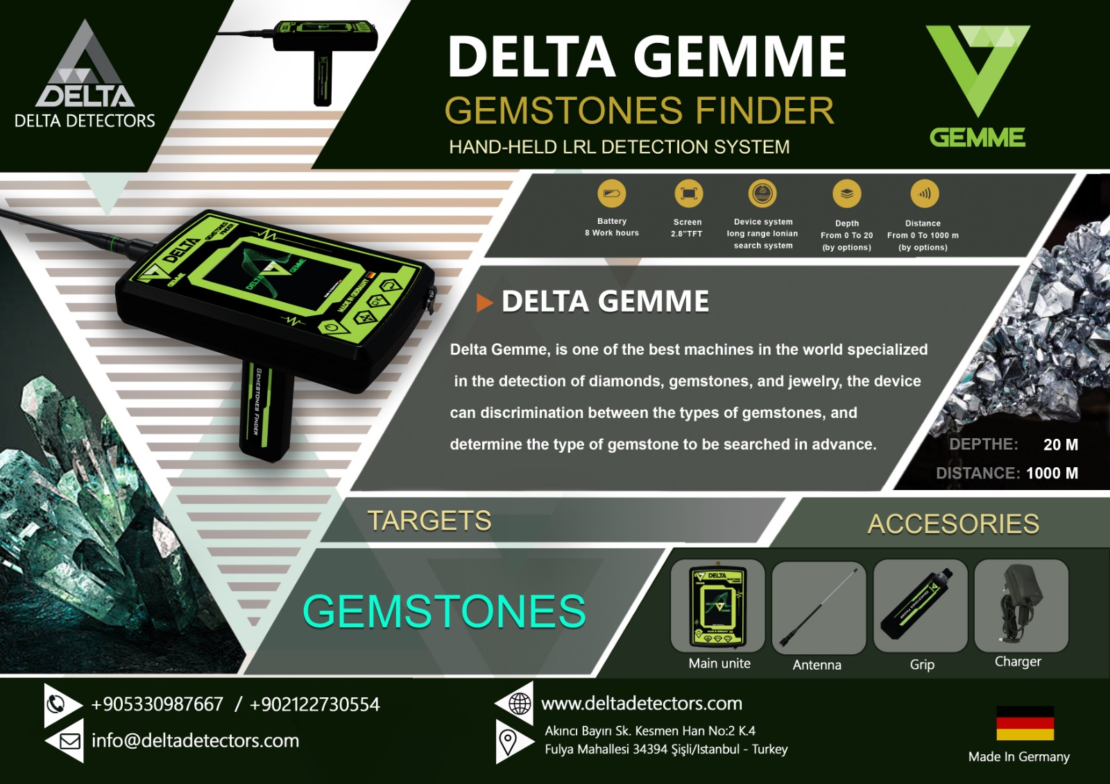 المواصفاتيتضمن الجهاز ما يليدليل المستخدمنظام الكشف:دلتا جيمي, يعمل بنظام الاستشعار عن بعد الصوتي المتطور للكشف عن الأحجار الكريمة والألماس.الاختصاص:متخصص في الكشف عن جميع أنواع الأحجار الكريمة: الماس – الزمرد – الياقوت – جميع الأنواع.العمق:عمق البحث يصل لغاية 20 متر، يمكن إختيار عمق البحث مسبقاً: 1م – 3م – 5م – 10م – 15م – 20م.المسافة:مسافة البحث تصل لغاية 1000 متر، يمكن اختيار مسافة البحث مسبقاً: 10م – 100م – 250م – 500م – 750م – 1000م.واجهة البحث:تعرض مؤشر البحث، وتتيح للمستخدم تتبع دقيق لموقع الهدف.يكتشف العمق والموقع والكثافة:يتم تحديد عمق وموقع الهدف تلقائيا على الشاشة، بشكل مصور ورقمي.نوع العرض: يحتوي على شاشة ملونة 2.8 إنش عالية الدقة، تمنح المستخدم ضبط دقيقاً ونتائج واضحة ومتكاملة حول عملية البحث.قائمة الضبط العام:تتيح للمستخدم ضبط ما يلي: